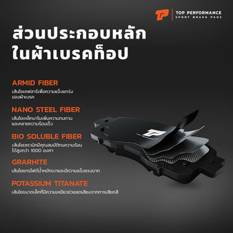 ผ้าเบรค TOP PERFORMANCE ผลิตด้วยวัตถุดิบคุณภาพสูงจากญี่ปุ่น ใช้เทคโนโลยีทันสมัยและมาตรฐานในการผลิต